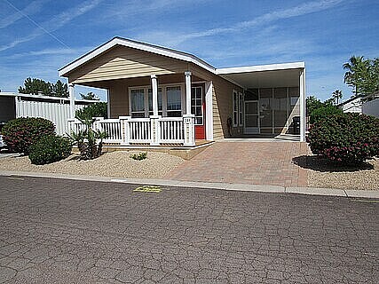 This beautifully maintained 18x53, 2-BEDROOM - 2-BATH CAVCO manufactured home is roomier than a park unit. *****Features a bright open floor plan w/neutral finishes, easy care LAMINATE WOOD-LOOK FLOORING throughout, 9 FOOT CEILINGS and LARGE WINDOWS that provide lots of natural light. *****Entrance is at ground level: no stairs or steps. The fully furnished interior offers effortless comfort & style from day one. ***** SPLIT LAYOUT ... master bed/bath at the rear, spare bed/bath at the front. Both baths feature walk-in showers: shower in master has built-in seats. *****QUEEN-SIZED BED bed in the master. Day bed in the spare room can be used as TWO TWINS or KING-SIZED BED ***** Home is complete with all major appliances and propane BBQ. *****Enjoy your morning coffee in the 24x12 SCREENED-IN ARIZONA ROOM or FRONT PATIO. A covered carport with EXTENDED DRIVEWAY gives additional parking. *****THE PARK ... Located close to freeways and shopping. Hacienda De Valencia is a welcoming 55+ community. Residents enjoy two heated pools, a relaxing spa, a large clubhouse for events and activities, a fitness center, billiards, shuffleboard courts, library, media room, picnic areas, and on-site management. Additional conveniences include RV storage, laundry facilities, a dog park, and beautifully maintained common areas. Water, sewer, and trash are bundled into one easy bill with the lot rent. This home is move -in ready and waiting for you to arrive. Just bring your toothbrush!